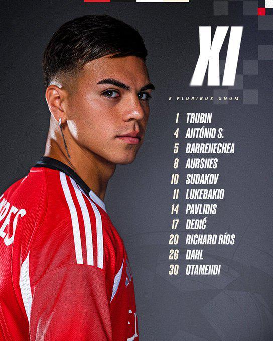 本菲卡首发:1-特鲁宾、17-德迪奇、30-奥塔门迪、4-席尔瓦、26-达尔、20-里奥斯、5-巴雷内希亚、11-卢克巴吉奥、10-苏达科夫、8-阿瑟斯、14-帕夫利迪斯